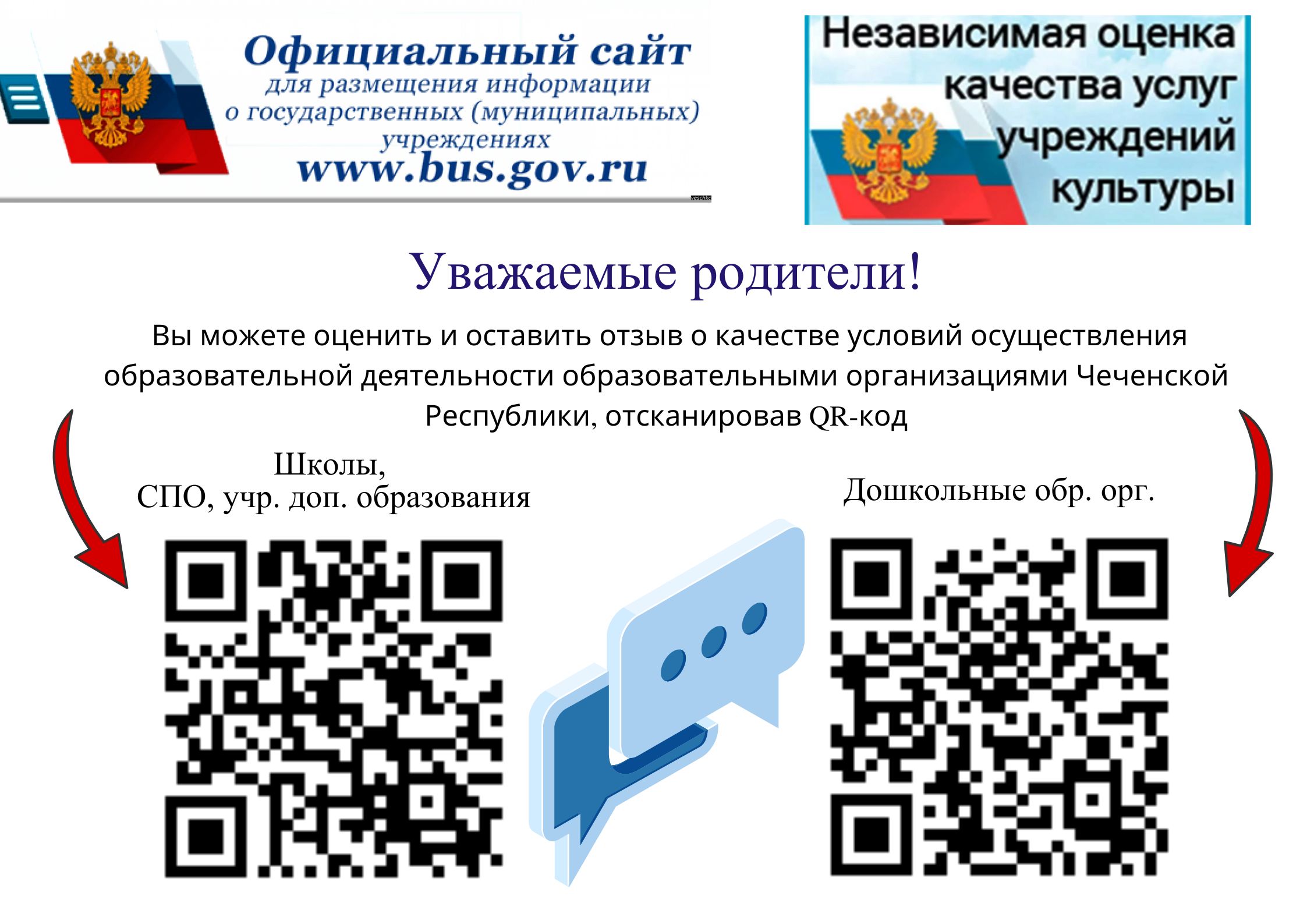 На портале https://bus.gov.ru/ Вы можете оценить и оставить отзыв о качестве условий осуществления образовательной деятельности образовательными организациями Чеченской Республики.