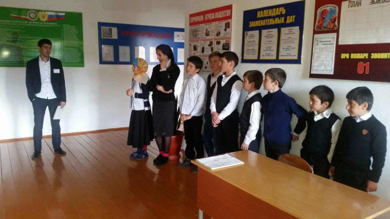 После того, как закончили тему, перешли к награждению. За участие в районном конкурсе чтецов «Живая классика» грамотой был награжден Баматов Адам ученик 8 класса. А также, учитель начальных классов Мажетов Ислам получил удостоверение Депутата сельского поселения.