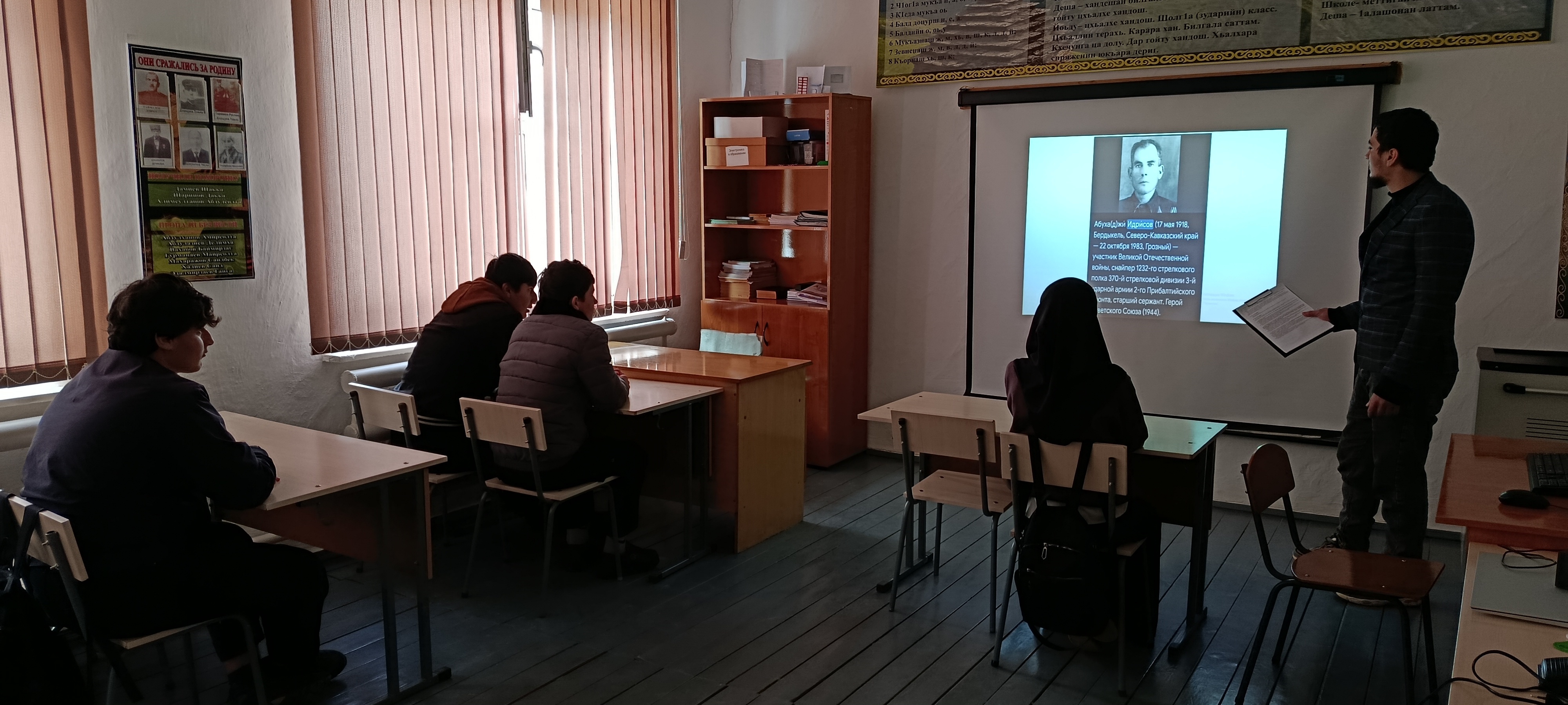 Урок был посвящен участнику Великой Отечественной Войны, выдающемуся снайперу 1232-го стрелкового полка 370-й стрелковой дивизии 3-й ударной армии 2-го Прибалтийского фронта, старшему сержанту, Герою Советского Союза Абухаджи Идрисову.